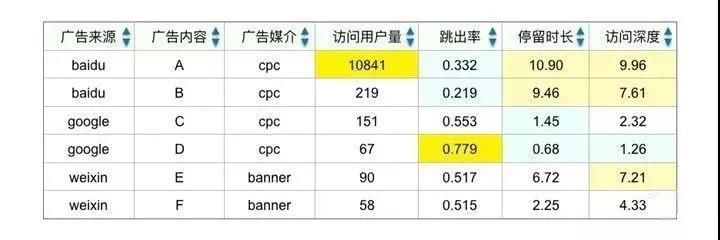 借助 UTM參數(shù),我們對每一次推廣或者投放的廣告進(jìn)行多維度監(jiān)測(來源、媒介、名稱、內(nèi)容和關(guān)鍵詞),評估不同渠道獲取新客戶的數(shù)量(訪問用戶量、新訪問用戶量)和獲客質(zhì)量(跳出率、停留時(shí)間、訪問深度)。