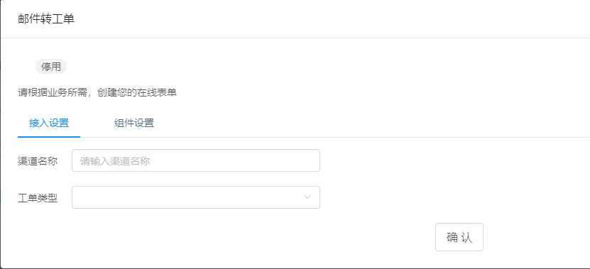 選擇郵件轉(zhuǎn)工單組件,按需填寫渠道名稱,工單類型等,按確定生成渠道。