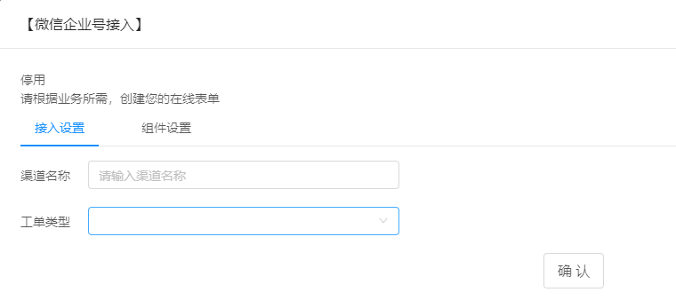 選擇微信企業(yè)號(hào)接入組件,按需填寫渠道名稱,工單類型等,按確定生成渠道。