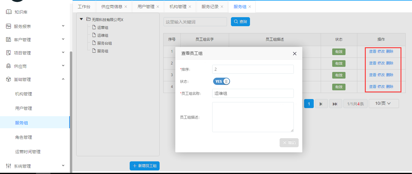 樹下面選擇指定員工組,點(diǎn)擊右側(cè)的操作按鈕對(duì)員工組進(jìn)行查看、修改、刪除等操作