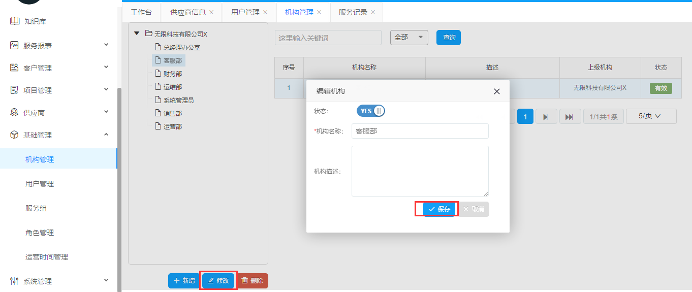 選擇一個(gè)機(jī)構(gòu),點(diǎn)擊修改。彈出對(duì)話框之后修改表單元素,如果確認(rèn)點(diǎn)擊保存,放棄點(diǎn)擊取消