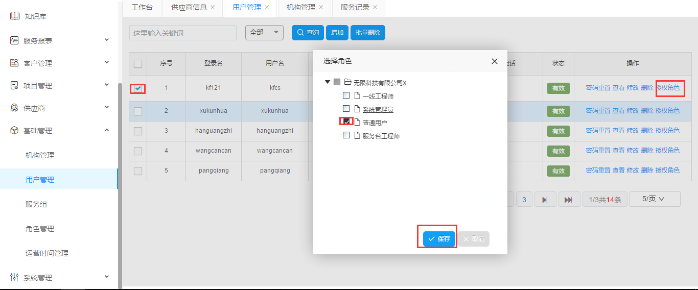 選擇一個(gè)用戶,點(diǎn)擊授權(quán)角色。彈出對(duì)話框之后勾選需要授權(quán)的角色,如果確認(rèn)點(diǎn)擊保存,放棄點(diǎn)擊取消