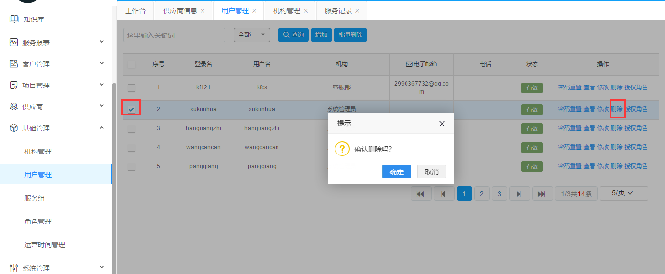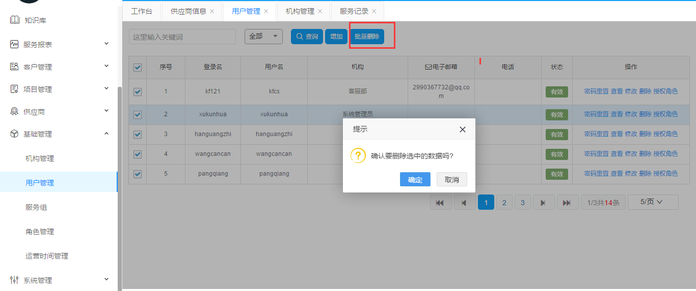 勾選用戶列表最前面的復(fù)選框(勾選左上角的為全選),點(diǎn)擊批量刪除。彈出對(duì)話框之后如果確認(rèn)點(diǎn)擊確定,放棄點(diǎn)擊取消