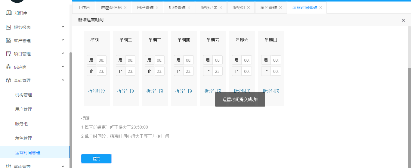 運(yùn)營(yíng)時(shí)間由工作時(shí)間和節(jié)假日組合而成,系統(tǒng)任何設(shè)計(jì)時(shí)間的流程都會(huì)參照默認(rèn)運(yùn)營(yíng)時(shí)間