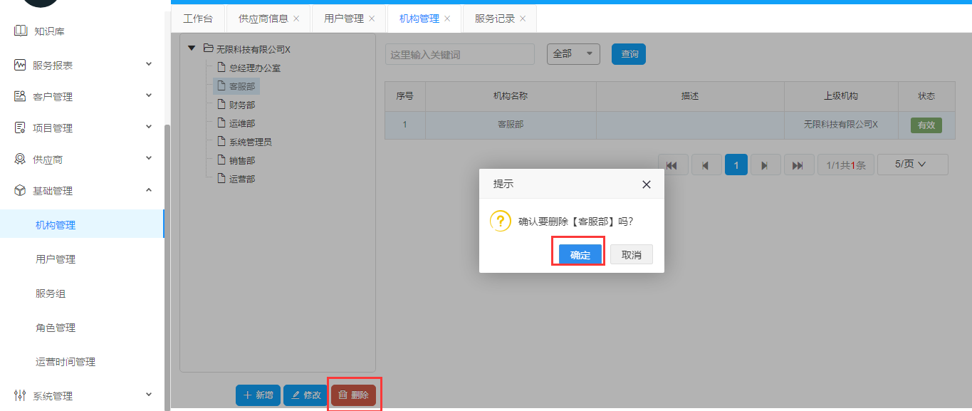 選擇一個(gè)機(jī)構(gòu),點(diǎn)擊刪除。彈出對(duì)話框之后如果確認(rèn)點(diǎn)擊保存,放棄點(diǎn)擊取消