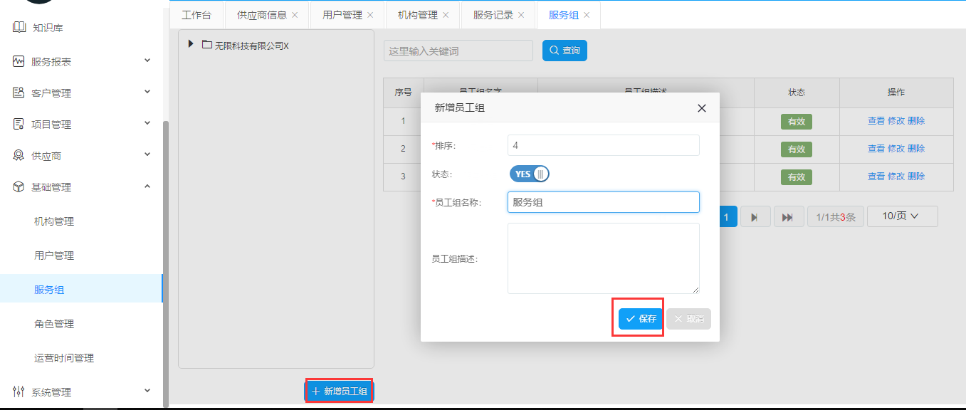 點(diǎn)擊新增員工組。彈出對(duì)話框之后填寫排序,員工組名稱,如果確認(rèn)點(diǎn)擊保存,放棄點(diǎn)擊取消