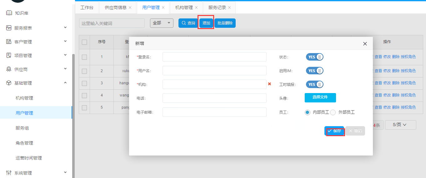 點(diǎn)擊增加。彈出對(duì)話框之后填寫登錄名,選擇機(jī)構(gòu)。建議您填寫用戶名,電話和電子郵箱。如果確認(rèn)點(diǎn)擊保存,放棄點(diǎn)擊取消