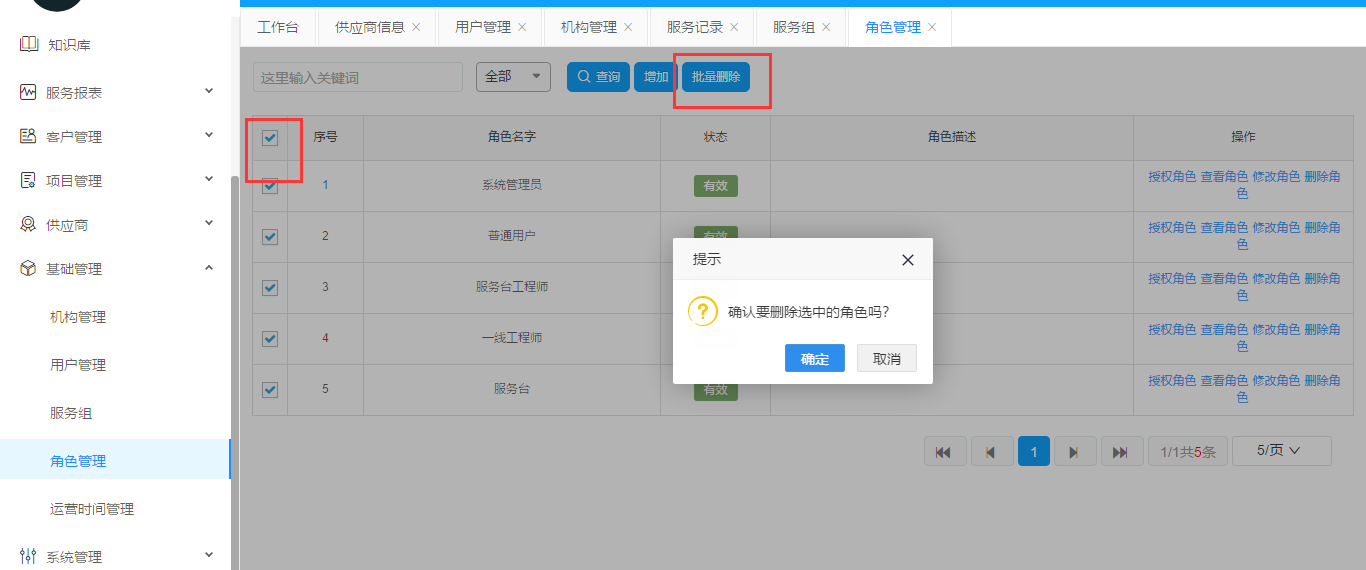 勾選角色列表最前面的復(fù)選框(勾選左上角的為全選),點(diǎn)擊批量刪除。彈出對(duì)話框之后如果確認(rèn)點(diǎn)擊確定,放棄點(diǎn)擊取消