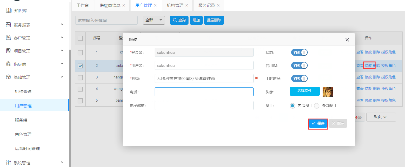 選擇一個(gè)用戶,點(diǎn)擊修改。彈出對(duì)話框之后修改表單元素,如果確認(rèn)點(diǎn)擊保存,放棄點(diǎn)擊取消