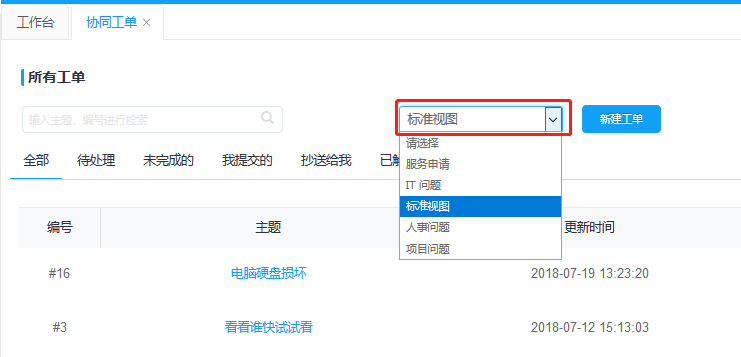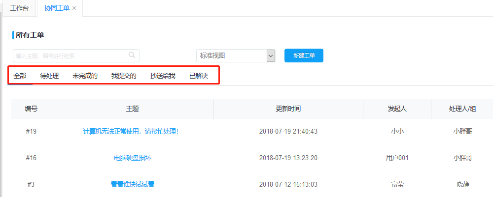 工單隊(duì)列分為全部、待處理、未完成、我提交的、抄送給我、已解決,可快速切換標(biāo)簽查詢到相關(guān)的工單,可同時(shí)采用檢索功能查詢需要處理的工單。