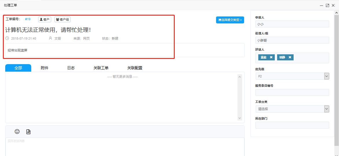 消息區(qū):工單詳情下側(cè)為消息區(qū),輸入消息實(shí)時(shí)溝通。