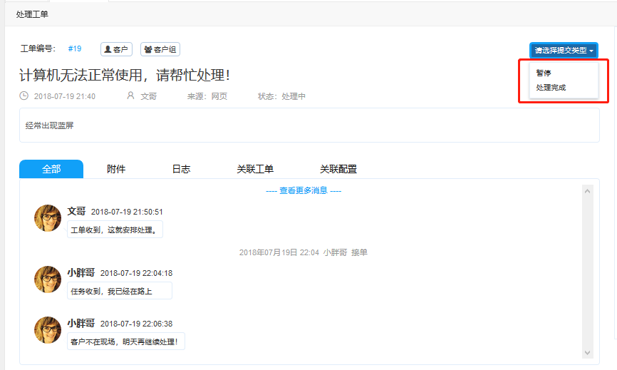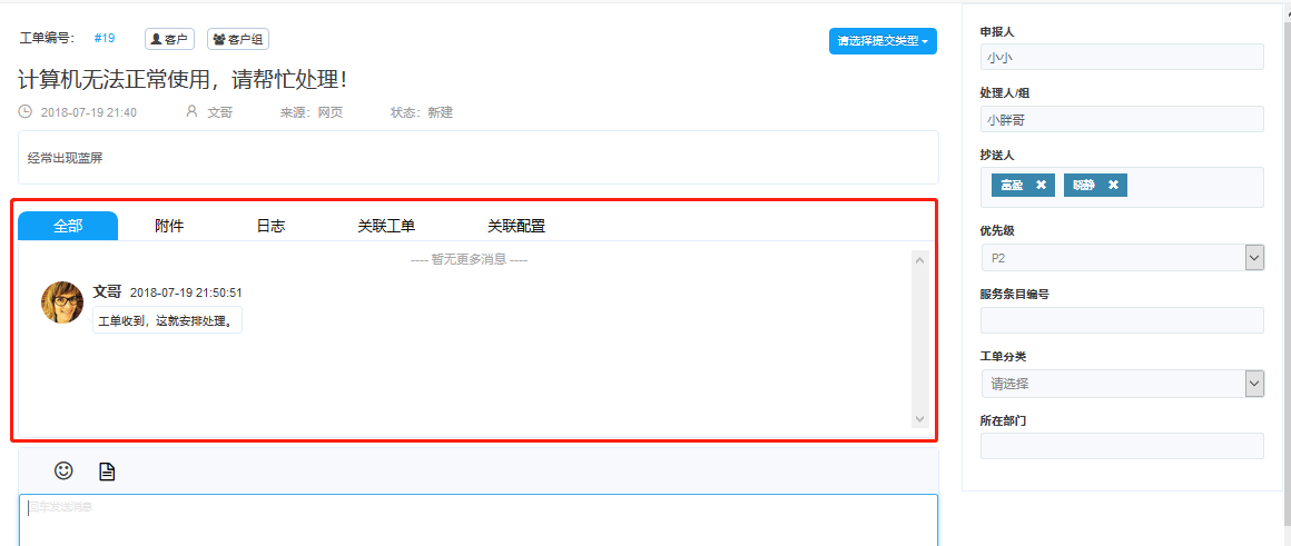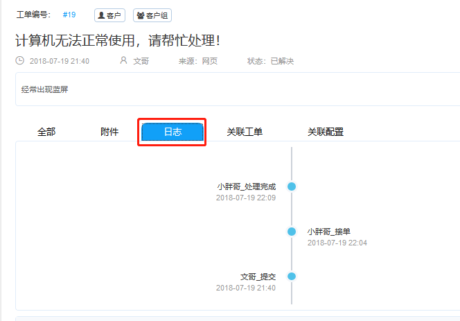 接下來(lái)是日志區(qū),包括溝通來(lái)往記錄、附件、日志、和關(guān)聯(lián)工單和配置。