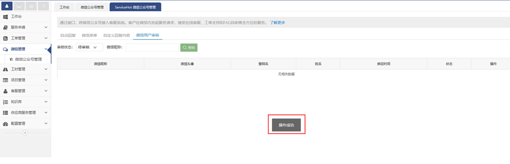 用系統管理員的賬號登錄ServiceHot ITSOM服務管理系統,點擊微信公眾號管理頁面的微信渠道【管理】按鈕,打開ServiceHot微信公眾號管頁面,點擊微信用戶審核這一欄,可以看到待審核的賬戶,點擊操作中的【審核】按鈕,即審核通過,審核通過的用戶可以在微信端執行提交及查詢工單的操作,相關步驟如下圖