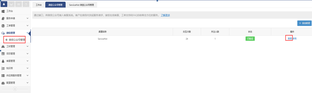 登錄到ServiceHot ITSOM服務管理系統,點擊頁面導航欄中的微信管理—微信公眾號管理,打開微信公眾號管理頁面,如下圖