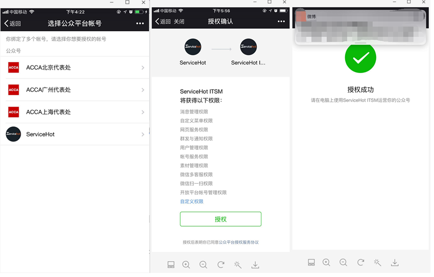 選擇你要授權的公眾號,點擊打開授權頁面,點擊【授權】按鈕,提示授權成功