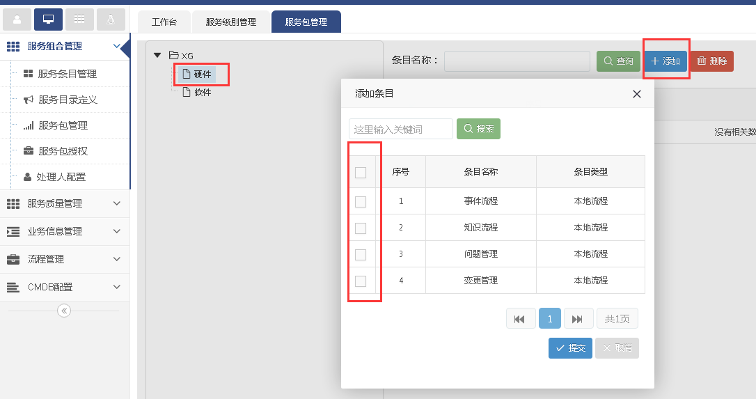 服務(wù)包添加服務(wù)條目:選擇一個(gè)服務(wù)包,在右邊列表處點(diǎn)擊添加。彈出對(duì)話框之后選擇服務(wù)條目,點(diǎn)擊提交(選擇了服務(wù)條目之后才可以使用條目里面的流程)