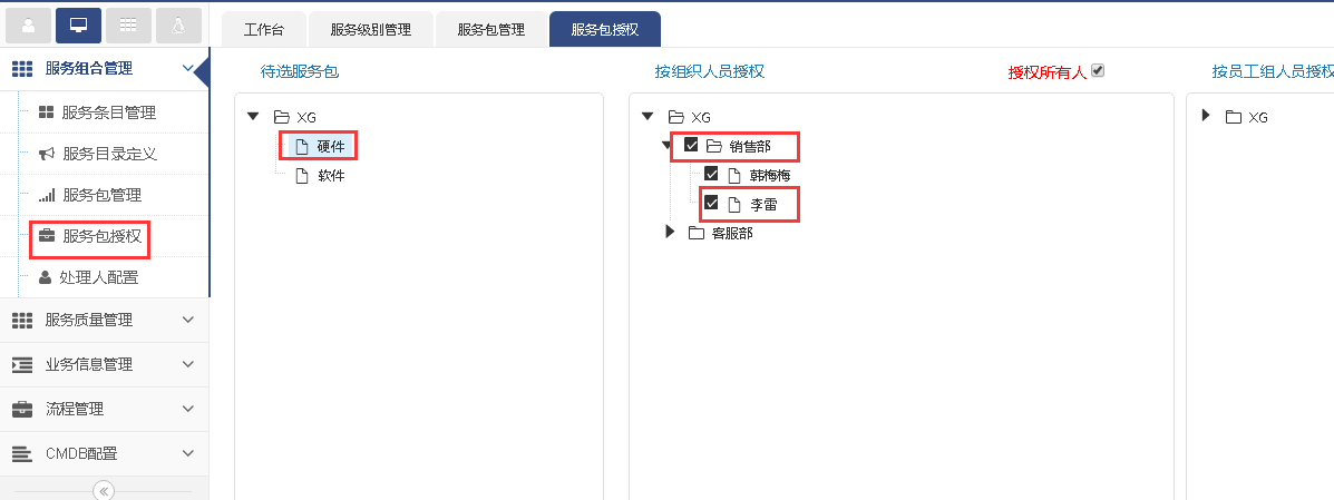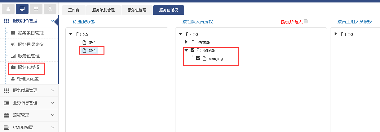 軟件這個(gè)服務(wù)包里包含了三個(gè)流程(變更管理,問題管理,知識(shí)管理),然后我們對(duì)軟件服務(wù)包進(jìn)行授權(quán),我們授權(quán)給客服部xiaojing這個(gè)部門成員