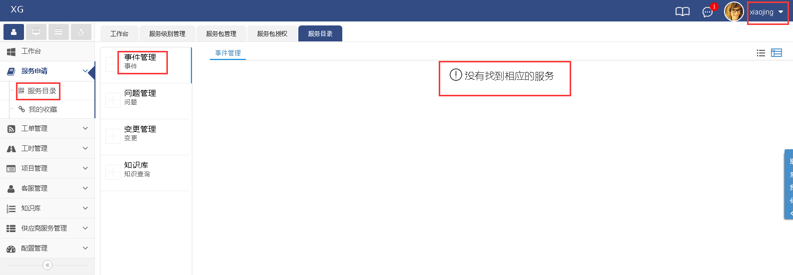 當(dāng)xiaojing登錄系統(tǒng)之后,服務(wù)申請(qǐng)里點(diǎn)擊事件管理會(huì)出現(xiàn)沒有找到相應(yīng)的服務(wù)(因?yàn)檐浖@個(gè)包里沒有事件管理)