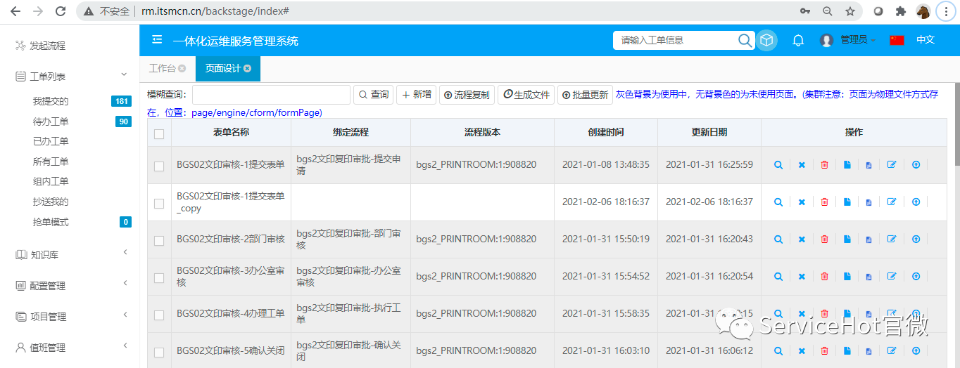 Servicehot產品為用戶提供流程引擎和頁面引擎功能,為便于管理員設計頁面時快速找到需要的頁面與流程進行綁定,本次優化頁面引擎,增加自動判斷綁定功能,已被流程綁定的頁面采用灰底色提醒,未綁定的頁面無底色。