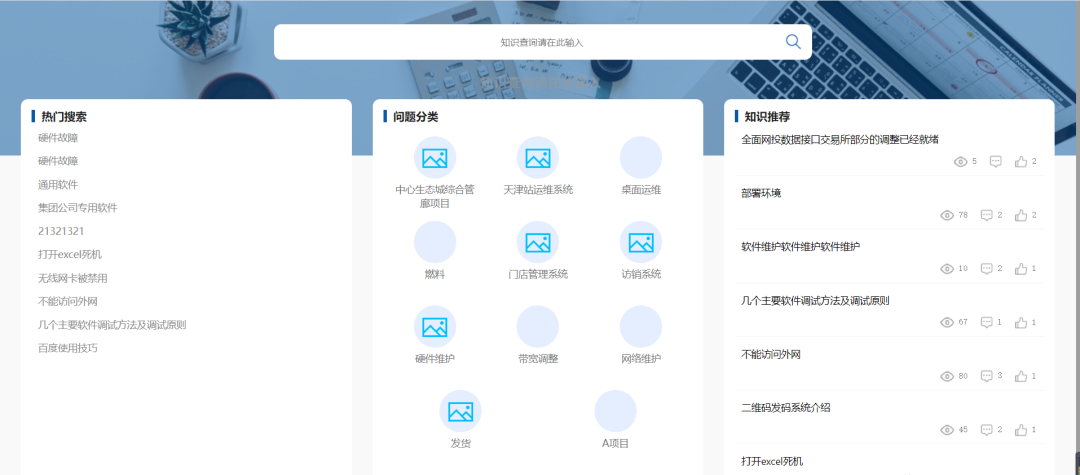 用戶知識庫分為三大模塊(熱門搜索、問題分類、知識推薦),系統(tǒng)智能的為用戶呈現(xiàn)感興趣的知識和解決方案。管理員可以挑選重要的知識目錄,配置呈現(xiàn)在自助服務(wù)門戶首頁,方便用戶查詢;