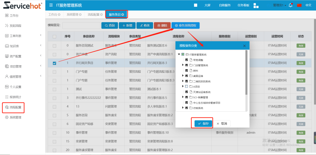 管理員可通過流程配置-服務(wù)條目對不同的業(yè)務(wù)系統(tǒng)進(jìn)行授權(quán)