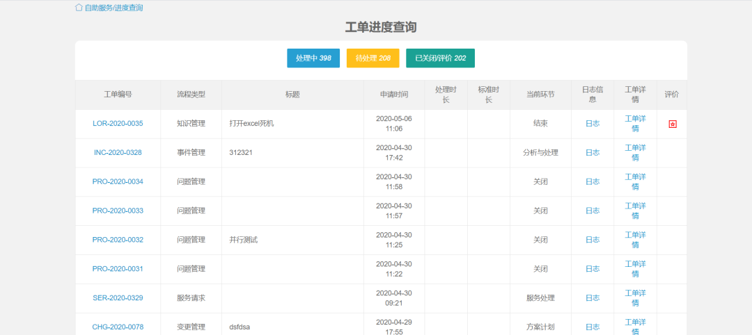 通過統(tǒng)一認(rèn)證、單點(diǎn)登錄,用戶進(jìn)入自助門戶后可一鍵查詢工單處理進(jìn)度,進(jìn)入工單詳情進(jìn)行反饋和催辦。