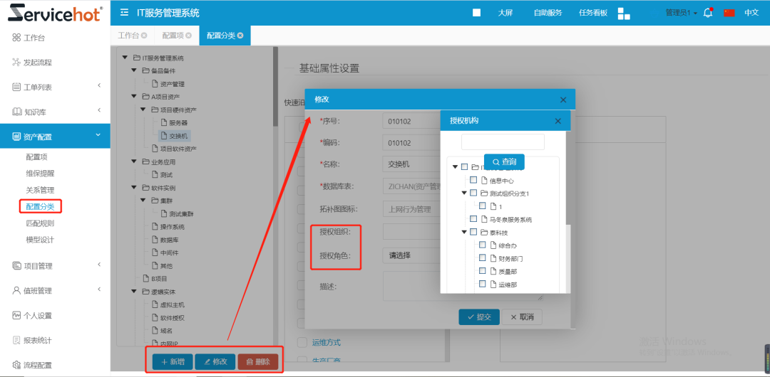 管理員可通過資產(chǎn)配置-配置分類對資產(chǎn)配置相應(yīng)的人員查看權(quán)限,可以選擇組織或角色進(jìn)行授權(quán)。