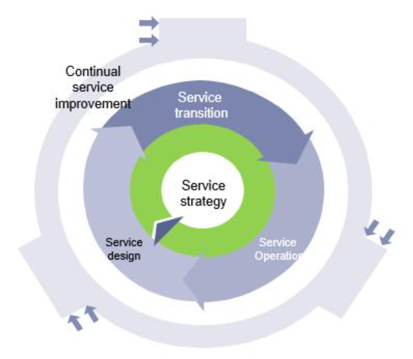 由此可以看出,ITIL 4的設計框架和ITIL 2011完全不同。ITIL 2011基于服務的生命周期,從服務戰(zhàn)略,服務設計、服務轉換、服務運營和服務的持續(xù)改進五個階段,講解了26個流程和4個職能,其框架見下圖。