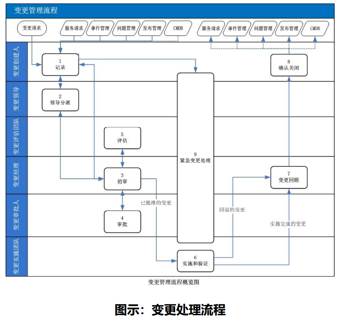變更是IT部門的工作流程,變更管理是指為在最短的中斷時(shí)間內(nèi)完成基礎(chǔ)架構(gòu)或服務(wù)的任一方面的變更而對(duì)其進(jìn)行控制的服務(wù)管理流程,當(dāng)問(wèn)題管理通過(guò)調(diào)查和分析發(fā)現(xiàn)問(wèn)題產(chǎn)生的根本原因,但不能制定恰當(dāng)?shù)慕鉀Q方案從根本上予以解決時(shí),問(wèn)題管理需要向變更管理提交變更請(qǐng)求,從而從通過(guò)實(shí)施必要的變更從根本上消除問(wèn)題的根源。變更管理流程是確保在變更實(shí)施過(guò)程中使用標(biāo)準(zhǔn)的方法和步驟,盡快地實(shí)施變更,以將由變更所導(dǎo)致的業(yè)務(wù)中斷對(duì)業(yè)務(wù)的影響減小到最低。