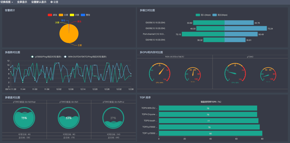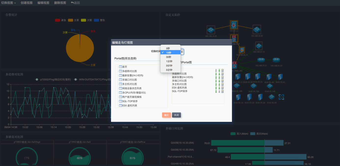運(yùn)維監(jiān)控系統(tǒng)對于不同用戶創(chuàng)建的自定義Portal視圖,可以通過 “走馬燈”的方式進(jìn)行多Portal視圖的輪詢展現(xiàn)功能。通過對不同的自定義Portal視圖進(jìn)行間隔的切換展現(xiàn),能夠使相關(guān)的人員能夠知道當(dāng)前IT網(wǎng)絡(luò)環(huán)境中所關(guān)注資源的整體運(yùn)行狀態(tài),了解每個部門或者用戶重點(diǎn)關(guān)注的資源實(shí)時(shí)狀態(tài),如下圖: