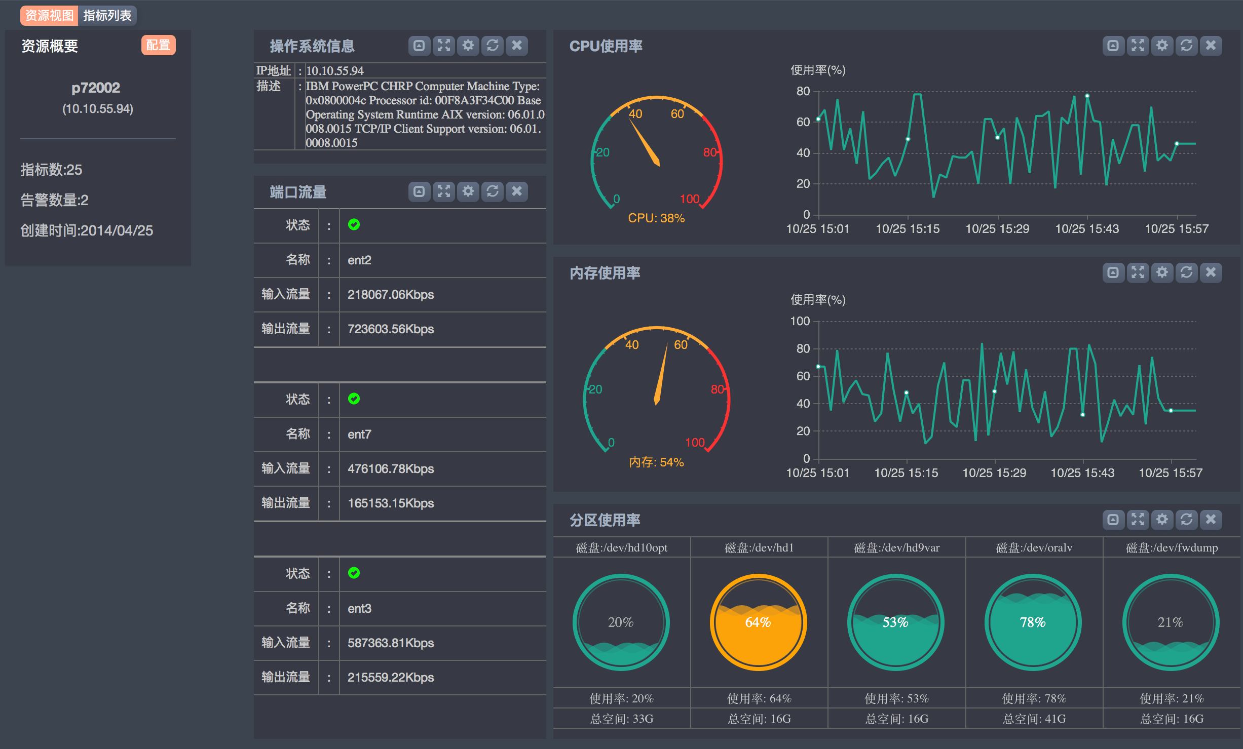 運(yùn)維監(jiān)控系統(tǒng)通過儀表盤、曲線圖等可視化的方式展現(xiàn)被監(jiān)控資源的主要指標(biāo)狀態(tài),如主機(jī)系統(tǒng)、云計(jì)算、weblogic中間件、數(shù)據(jù)庫、服務(wù)器硬件等等,如下圖所示。