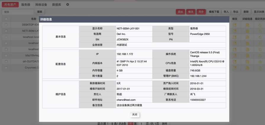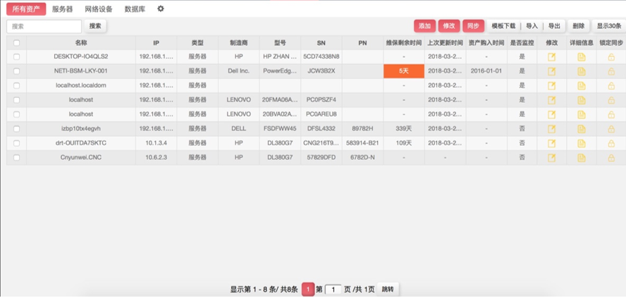 對于服務(wù)器硬件,系統(tǒng)可自動發(fā)現(xiàn)制造廠商、型號、SN、PN等關(guān)鍵信息,并且可以自動同步到相應(yīng)的資產(chǎn)記錄當(dāng)中;對于維保時(shí)間,可通過手動自定義維保時(shí)間,當(dāng)維保到期,出現(xiàn)高亮或者告警提示,代替資產(chǎn)管理人員維護(hù)資產(chǎn)生命周期。