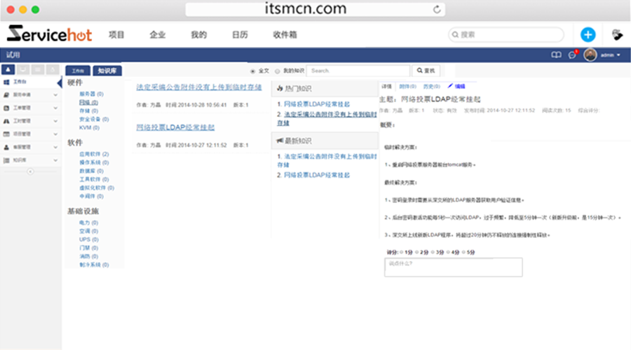 ServiceHot知識(shí)庫是一個(gè)解決方案的匯總,針對(duì)各種IT應(yīng)用和設(shè)備故障現(xiàn)象,知識(shí)庫提供了系列行之有效的解決方案。知識(shí)庫引入了國際通用的WIKI平臺(tái),除了知識(shí)庫管理者可以維護(hù)知識(shí)庫記錄外,任何使用者都可以添加個(gè)人的評(píng)論,各種評(píng)論都可以作為版本的一部分保留于知識(shí)庫中,通過使用者的評(píng)價(jià)和完善,后續(xù)使用者可以獲得更加完美的解決方案。