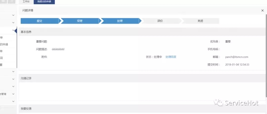 當(dāng)然,在工單處理結(jié)束之前,創(chuàng)建人和受理人雙方也許就工單的處理情況需要進(jìn)行協(xié)商,這時(shí),就可以通過“我要反饋”,來進(jìn)行雙方的交流。
